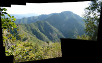 その先は再びきつい登り。息が切れたところで振り返ると、鳳来寺山から東に弧を描きつつ下って、また登ってきた尾根が見える。